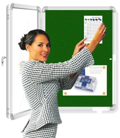 Packaging Details: Choice of six felt colors Green, Red, Blue, Grey, Maroon & Beige. Use push pins to pin notices. Soft board backing. Front cover with aluminum framed acrylic sheet - lockable. Provided with 2 keys. For indoor use. Size above 90180 will have 2 or 3 doors ( On Request)