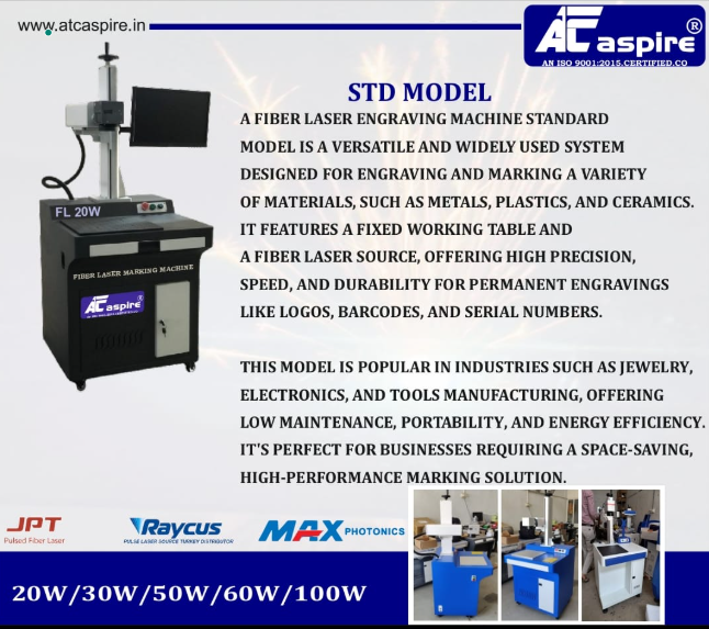 A FIBER LASER ENGRAVING MACHINE STANDARD MODEL IS A VERSATILE AND WIDELY USED SYSTEM DESIGNED FOR ENGRAVING AND MARKING A VARIETY OF MATERIALS, SUCH AS METALS, PLASTICS, AND CERAMICS. IT FEATURES A FIXED WORKING TABLE AND A FIBER LASER SOURCE, OFFERING HIGH PRECISION, SPEED, AND DURABILITY FOR PERMANENT ENGRAVINGS LIKE LOGOS, BARCODES, AND SERIAL NUMBERS.
