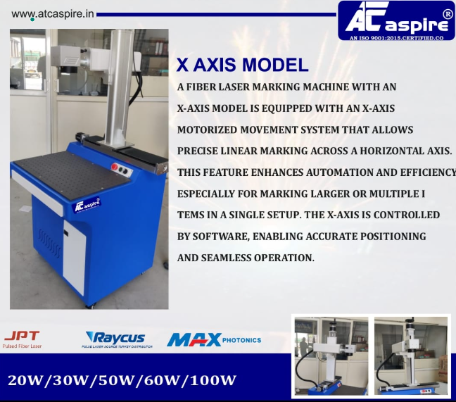 A FIBER LASER MARKING MACHINE WITH AN X-AXIS MODEL IS EQUIPPED WITH AN X-AXIS MOTORIZED MOVEMENT SYSTEM THAT ALLOWS PRECISE LINEAR MARKING ACROSS A HORIZONTAL AXIS. THIS FEATURE ENHANCES AUTOMATION AND EFFICIENCY ESPECIALLY FOR MARKING LARGER OR MULTIPLE I TEMS IN A SINGLE SETUP. THE X-AXIS IS CONTROLLED BY SOFTWARE, ENABLING ACCURATE POSITIONING AND SEAMLESS OPERATION.
