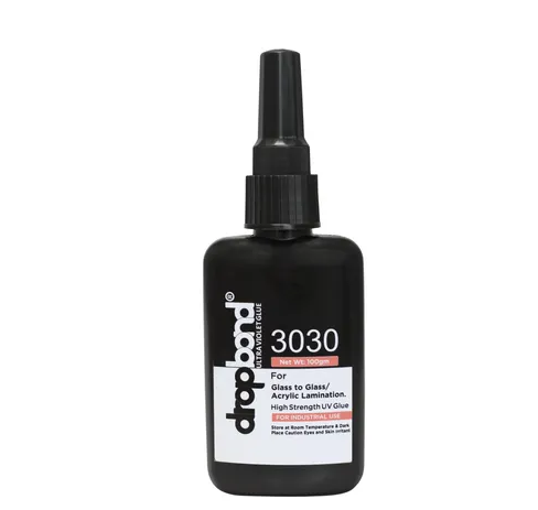 Drop Bond 3030, bonds and seals glass to glass, or glass to paper for lamination. This product is cured when exposed to UV radiations. The speed of cure will depend on the UV intensity as measured at the product surface. This is an amazing liquid adhesive that only sets when exposed to UV light. Simply shine the UV light on the adhesive to cure. The adhesive hardens quickly and dries crystal clear. Drop Bond UV Glue should only be used on repairs where the UV light can penetrate the adhesive.
