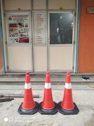 Multipurpose Traffic Cone made of PVC (using UV Stabilizers) with special design of Black Rubber Base to grip the cones to the floor with 4" Microprismatic PVC White Reflective Tape for High Visibility.