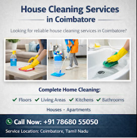 "Covai Cleaning Experts is a professional cleaning service in Coimbatore, specializing in home cleaning, house keeping, bathroom cleaning, office cleaning, and deep cleaning services. Our trained team uses modern equipment and eco-friendly products to deliver hygienic and reliable cleaning solutions. We serve residential and commercial properties across Coimbatore with a focus on quality, punctuality, and customer satisfaction. Contact Covai Cleaning Experts today for trusted and professional cleaning services in Coimbatore."