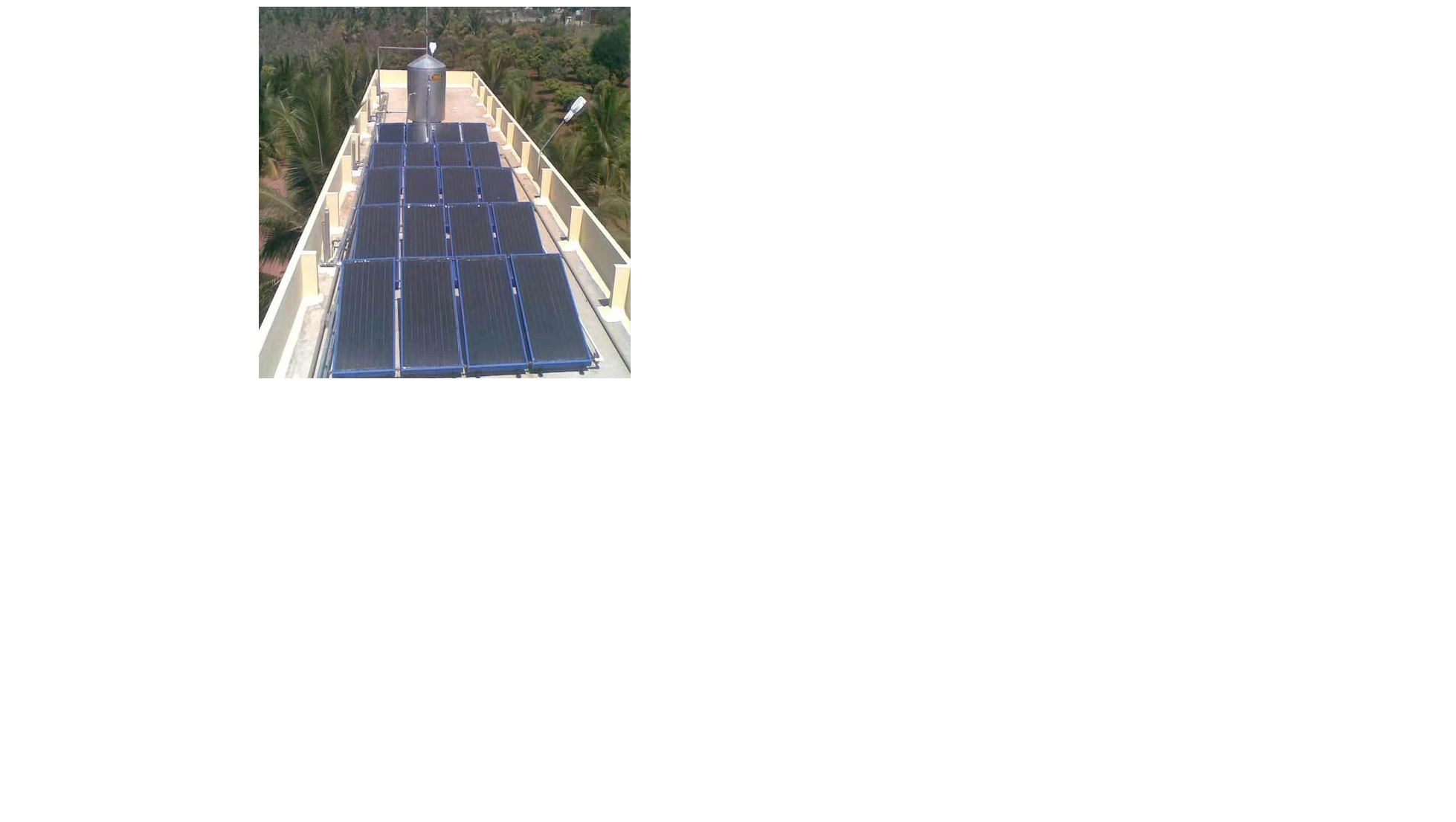 v The solar water heating system installed for multi storied buildings, process industries, apartment complexes, hospitals, hotels etc. works on the same basic principle, but is specifically designed to meet rigorous requirement of such conditions.