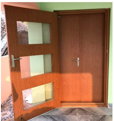 Double door with one door opens outside and one door inside with wood finish,One is solid door and other one is mesh door,There will be three shutters on a double rebate frame, one with mesh and grill.
