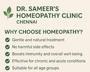 "Dr. Sameer’s Homeopathy Clinic – Gentle Healing, Proven Results Located in the heart of Chennai, Dr. Sameer’s Homeopathy Clinic is dedicated to providing safe, natural, and effective treatments for a wide range of health conditions. With years of experience and a compassionate approach, Dr. Sameer specializes in personalized homeopathic care that addresses the root cause of illness, not just the symptoms. Whether you are seeking relief from chronic ailments, allergies, skin problems, respiratory issues, or lifestyle-related disorders, we focus on holistic healing tailored to your unique needs. Our clinic is known for its patient-friendly atmosphere, transparent consultations, and lasting results. Visit Dr. Sameer’s Homeopathy Clinic and"