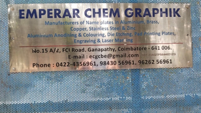 Emperar Chem Graphik was established in the year 1991 at Tamil Nadu and has been a trailblazer in Manufacturing wide gamut of Stainless Steel Nameplate, Aluminum Nameplate, Brass Nameplate, etc. Our range of products is widely appreciated for quality, design and durability. We develop latest designs to encrypt on the Name Plates considering the latest trends in the market. Our company also offers Aluminium Anodizing & Colouring services that are highly useful to strengthen the aluminum surface.