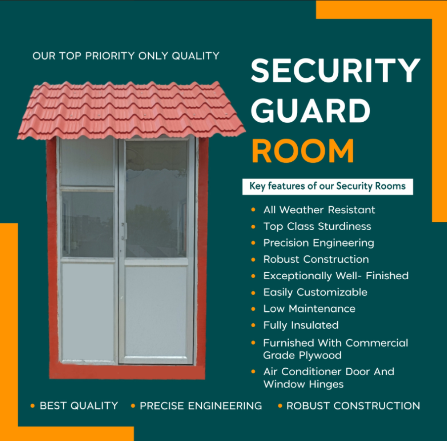 All weather resistant, Top class sturdiness, Precision engineering, Robust construction, Exceptionally well-Finished, Easily customizable, Low maintenance, Fully Insulated, Furnised with commercial grade plywood and Air conditioner door and window hinges. (A security guard room, also known as a security cabin, guard shack, or sentry box, is a compact, enclosed, and often prefabricated structure designed to provide a safe and sheltered workspace for security personnel. These portable structures are easily installed and relocated, offering a flexible security solution for various environments.)