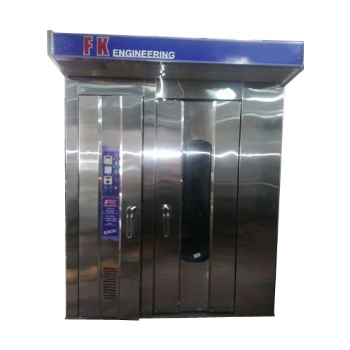 Rotary rack oven is essentially a convection oven with removable trolley racks. Air is heated by burning fuel in a chamber. Fuel can be diesel (most popular), LPG, wood, coal and electric. Air is heated by blowing air on chamber, using a centrifugal blower.