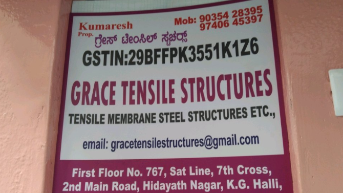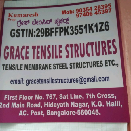 7 viewsEstablished in the year 2019 at Bengaluru, Karnataka We “Grace Tensile Structures” are a Sole Proprietorship based firm, engaged as the foremost Wholesaler And Service Provider of Tensile Structure, Car Canopy, Fabrication Service and many more.