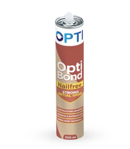 Optibond Nailfree is a synthetic rubber based, one component, multipurpose, high-quality adhesive. The quick-grab formula provides a heat & water-resistant bond with fewer nails or fasteners required. It reduces squeaks, nail pops and splitting. Optibond Nailfree can be used to eliminate the need for nails and screws in many construction applications, decorations, DIY and repair work.
