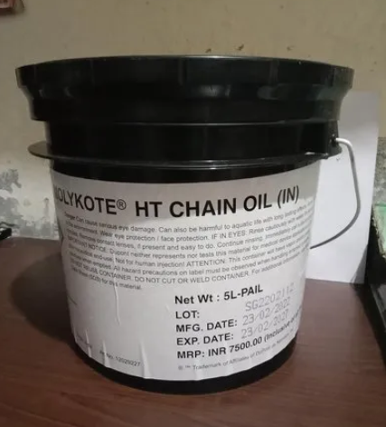 Molykote® HT Chain Oil-(IN) High temperature Chain Oil helps prevent wear and process interruptions in various high temperature chain applications such as: Textile Stenter, Paint line drag chains, bakery oven chains wherein non-food grade lubricant can be used etc.,. Compared to conventional oils, they also offer greater resistance to oxidation and stable performance at high temperatures and under high loads. Molykote® HT Chain Oil (IN) High temperature Chain Oil maximizes relubrication intervals and maintains viscosity characteristics at wide temperature ranges. It is known to form low carbon deposits owing to “No” ash content in its formulation which makes it ideal for Textile applications where carbon deposition results in a lot of finishes product rejections which is a huge menace