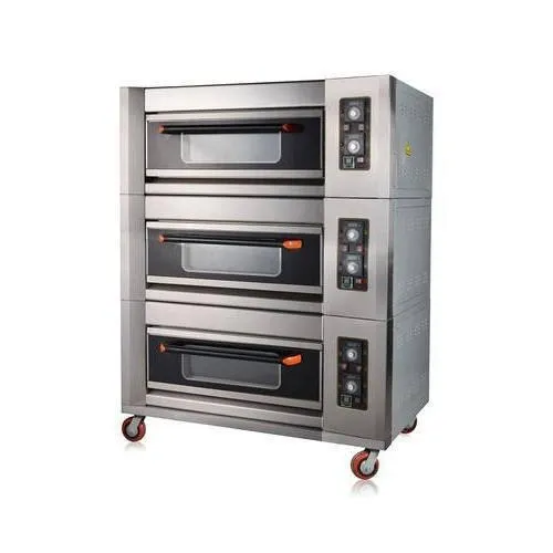 A deck oven is a large, enclosed baking chamber with one or more shelves or decks. The oven is heated by either gas or electricity, and the heat is evenly distributed throughout the baking chamber by forced hot air circulation.