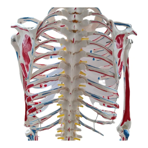 The model is anatomically correct. All over 200 bones, anatomical details and structuresare represented. The joints are movable. Arms and legs can be removed easily via simplescrew connections. The skull is removable and consists of the base of skull, Calvarium,jaw (on spring).Features nerve branches, vertebral artery & herniated lumbar disc. Themodel is made of high quality PVC and therefore durable and easy to clean. The skeletonis assembled. Minor assembly can be done within a few minutes without tools. Specialfeature. The left side of the skeleton shows the points of origin (red) and the points ofinsertion (blue) of the muscles. With flexible ligaments on right side makes it possible todemonstrate all kinds of human movement of the arm and leg.