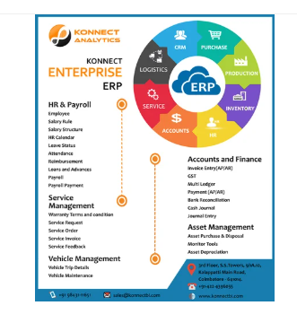 Konnect Analytics headquartered in Coimbatore, India is a rapidly growing product and consulting company that focuses on providing cloud-based Enterprise solutions.Konnect Analytics offers exceptional ERP, Business Intelligence (BI) ,CRM solutions across all Industries. Konnect was started in 2015, by a team of experts who have spent more than 15 years in implementing ERP and other Enterprise solutions for SMEs and Larger enterprises in Manufacturing, Oil Gas, Retail, Telecom, Textiles and many such other domains. This expertise is infused.