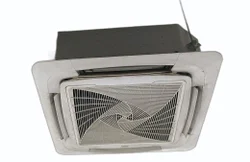 A cassette air conditioner is a type of split air conditioning system where the indoor unit is mounted on the ceiling. It's characterized by a rectangular unit that is installed flush with the ceiling, with only the grille visible, making it a discreet and efficient cooling solution for larger spaces.