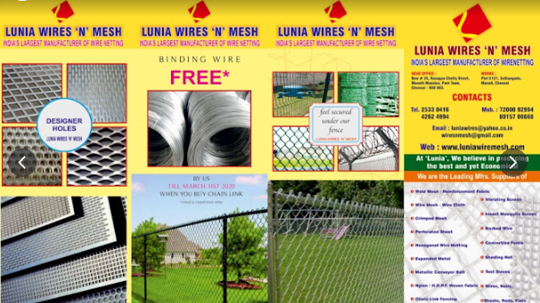 15 viewsstablished in the year of 2006, Lunia Wires N Mesh is one of the well known companies in the market. Our ownership type is partnership. The head office is located in Chennai, Tamil Nadu. We are the foremost Manufacturer and Wholesaler of Weld Mesh, Wire Mesh, Chain Link Fencing and many more. The whole range is made up by utilizing qualitative raw material.