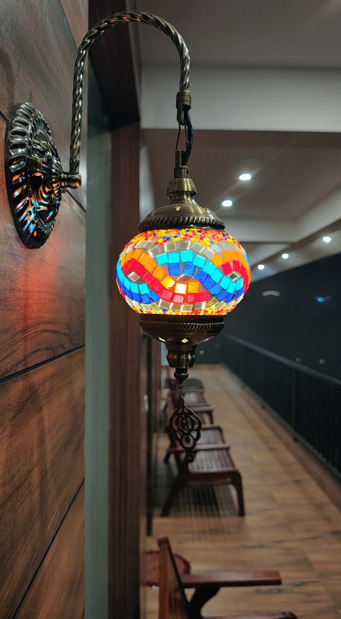 Turkish Moroccan Mosaic Wall Sconce. These lamps are distinguished by their handcrafted glass mosaic panels in vibrant colors, often featuring traditional patterns like stars or floral designs.