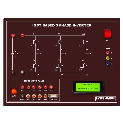 This IGBT Based Three Phase Inverter Kit has IGBT, DC Source Voltage, Inbuilt Triggering Pulse unit, LCD Display Unit, 3Ph Lamp Load and Fused Protection.