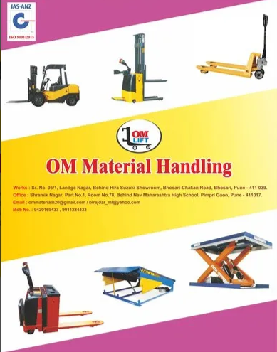 Established in the year 2000, we, “Om Engineering, Bhosari”, have etched a remarkable name for ourselves in the domain of manufacturing, supplying and exporting an impeccable range of Material Handling Equipments such as Pallet Trucks, Hydraulic Pallet Truck, Industrial Stacker, Industrial Lifts, Industrial Cranes. Our wide product range encompasses Paper Reel Loader, Articular Cranes, Order Picker, Dock Leveler, Four Wheeler Tugger, High Lift Pallet Truck, Manual Stacker, Full Electric Stacker, Platform Stacker, Stationary Stacker, Hydraulic Lift, Fork Lift, Folding Crane, Shop Crane, Hydraulic Pallet Truck and many more. Our team of qualified professionals use only an superior grade components and spare parts while fabricating this equipment. Used in a variety of industrial applications, this equipment is accepted for its robust construction, high energy efficiency, low maintenance, noise free operations and dimensional accuracy.