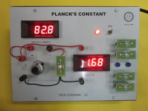 Gradually increase the current through the LED by increasing the supply DC voltage until light emission barely becomes visible. The voltage measure with the multimeter at this point is V0. If the LED does not light up, then reverse the cable connections at the power supply.The energy E of a photon of frequency f is E = hf , where h is Planck's constant (h = 6.63 x 10-34 Js). Plotting ∆V against f for LEDs of several different colours produces a straight line of slope h/e. Measuring the graph's slope and multiplying it by e yields Planck's constant.We use LEDs in this experiment because each colour of LED has a different threshold voltage at which electrons start being produced. Measuring this voltage, together with known values for the emission wavelengths, provides a path to finding a value for the Planck constant.