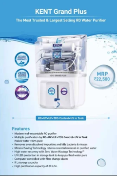 RO UV TDS.KENT Grand+ is the most trusted and largest selling RO Water Purifier with KENT's Mineral ROTM technology to provide 100% pure and mineral-rich purified water. Equipped with Zero Water Wastage Technology, this purifier ensures that no drop of water is wasted during purification process.