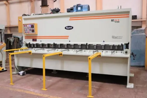 Hydraulic Shearing Machine MS Steel Fabricated Body with all type of Standard Accessries Hydraulic Shearing Machine fabricated from IS-2062 graded rolled steel plates table and cutting beam are deeply reinforced and fines machines after stress reliving. The interlocked design put the direct support to frame. This frame is strain free and eliminates welds at load supports. Thus the accuracy of the machine is never disturbed.