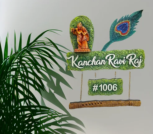 Divine Radha Krishan Nameplates with Morpankh, crafted with utmost care to add a divine touch to your home decor This nameplate is handcrafted in MDF wood and is perfect for housewarming, wedding and a thoughtful gift for your loved ones as well