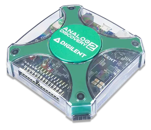 Digilent Analog Discovery 2 is a USB oscilloscope, logic analyzer, and multi-function instrument that allows users to measure, visualize, generate, record, and control mixed-signal circuits of all kinds. Developed in conjunction with Analog Devices and supported by Xilinx University Program. This test and measurement device is small enough to fit in your pocket, but powerful enough to replace a stack of lab equipment, providing engineering professionals, students, hobbyists. and electronic enthusiasts the freedom to work with analog and digital circuits in virtually any environment, in or out of the lab. The analog and digital inputs and outputs can be connected to a circuit using simple wire probes; alternatively, the Analog Discovery BNC Adapter and BNC probes can be used to connect and utilize the inputs and outputs.