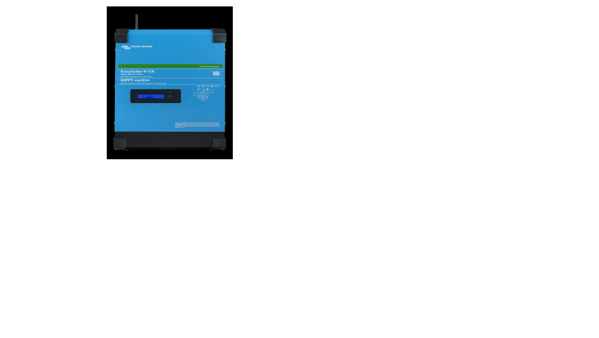 All-in-one solar power solution. The EasySolar-II GX combines an MPPT Solar Charge Controller, an inverter/charger and control hub in one enclosure. The product is easy to install, with a minimum of wiring. Models: 3000VA, 5000VA.