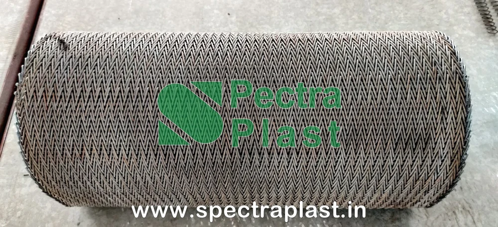 Compound balanced belt is produced with right-and left-hand spirals fitted closely together for a smooth, dense weave generally assembled with a straight connecting rod.