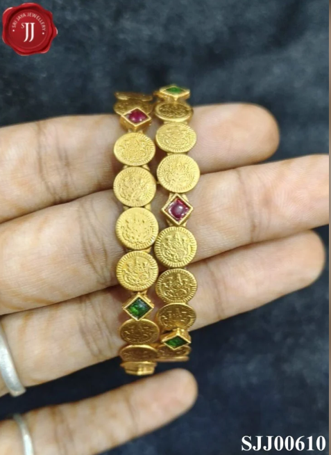 Discover our exclusive collection of Antique Imitation Bangles, designed with traditional temple motifs, coin patterns, and ruby-green stone embellishments. Crafted with high-quality majjakk material and antique gold finish, these bangles beautifully replicate classic South Indian jewelry. Perfect for weddings, festive occasions, and bridal wear, they add a timeless charm to any attire.