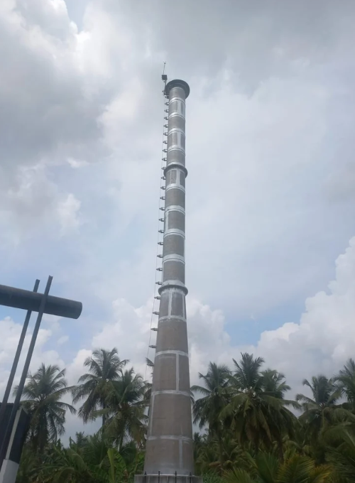 An industrial mild steel (MS) chimney, also known as a steel stack, is a structure for discharging hot gases, smoke, or fumes from industrial equipment like boilers, furnaces, and generators. Compared to concrete chimneys, mild steel chimneys are often more economical, have a shorter installation time, and are suitable for process work requiring low thermal capacity.