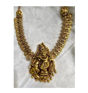 A Kasu Haram (also known as Kasu Malai or Kasulaperu) is a traditional South Indian long necklace crafted from closely linked gold coins, symbolizing prosperity and cultural heritage. The word kasu means coin in Tamil and Malayalam, while haram refers to a long necklace.