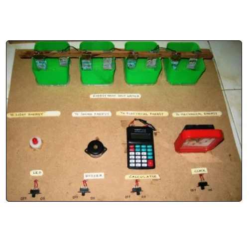This working prototype converts sea/ocean water to power Light, Clock, Buzzer and Calculator-4 in 1 Project. The project looks like students made using house hold items (non industrial material) and at the same time economical working and innovative based. Student can add/remove any/all components in project.