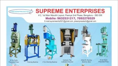 Supreme Enterprises is a leading name in the industry, established itself in the year 2012 with Sole Proprietorship Ownership. We are the manufacturer of different Industrial Machine tools and components. We are based at Peenya , Bengaluru, Karnataka, India. Our product range includes Clinching Machine, Hydro Tester, Riveting Machine, Shaft Straightening machine, Punching Machine and many more. And all kinds of Sensors for industrial Purposes which are in the list. Our products are in a huge demand in the market. We cover a large market area across South India and nation wide. Our some of the product have automation quality according to their need. They are perfectly aligned and easy to maintain.