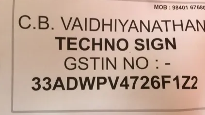 18 viewsHeadquartered at Padi, Chennai, Tamil Nadu, “Techno Sign” has the potential to keep up with the constant requirements of our clients in given time period. We are a Sole Proprietorship (Individual) based entity, that not only concentrate on maximizing profit but its chief apprehension is the contentment of clients. Since 2008, we are growing rapidly in the market by the steady shipment of qualitative shipments to the clients end. The assortment of products we manufacture for our customers are Sign Board, Writing Board, Name Plate, Writing Board Stand, PVC Sticker and many more.