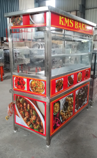 A 2-burner chat counter is a type of food display and cooking unit, typically made of stainless steel, designed for serving and showcasing snacks or light meals, especially in street food or restaurant settings. It features two burners for cooking and a display area for presenting the food. These counters are often used in outdoor settings, like street food stalls, or in restaurants for serving chat items.