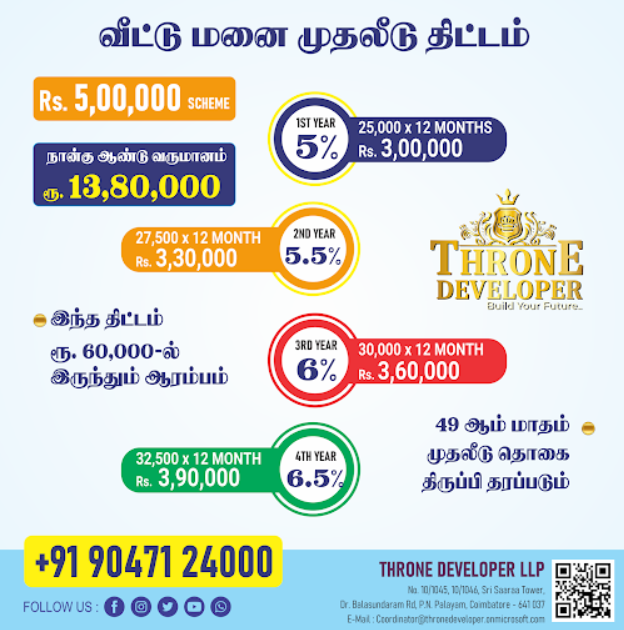 "Throne Developer LLP, a VL Promoters Pvt Ltd subsidiary, is a property investment company headquartered in Coimbatore, serves multiple land-based investment schemes which brings you standard monthly income."