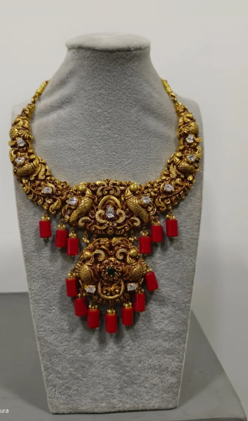 Add a touch of royal charm to your collection with the Tura Coral Peacock Necklace, a true masterpiece in 22kt gold. With an intricate design inspired by nature, this necklace features a stunning peacock motif adorned with vibrant coral accents. Weighing 80 grams, it strikes the perfect balance between elegance and opulence, making it ideal for special occasions such as weddings, festivals, and traditional ceremonies.
