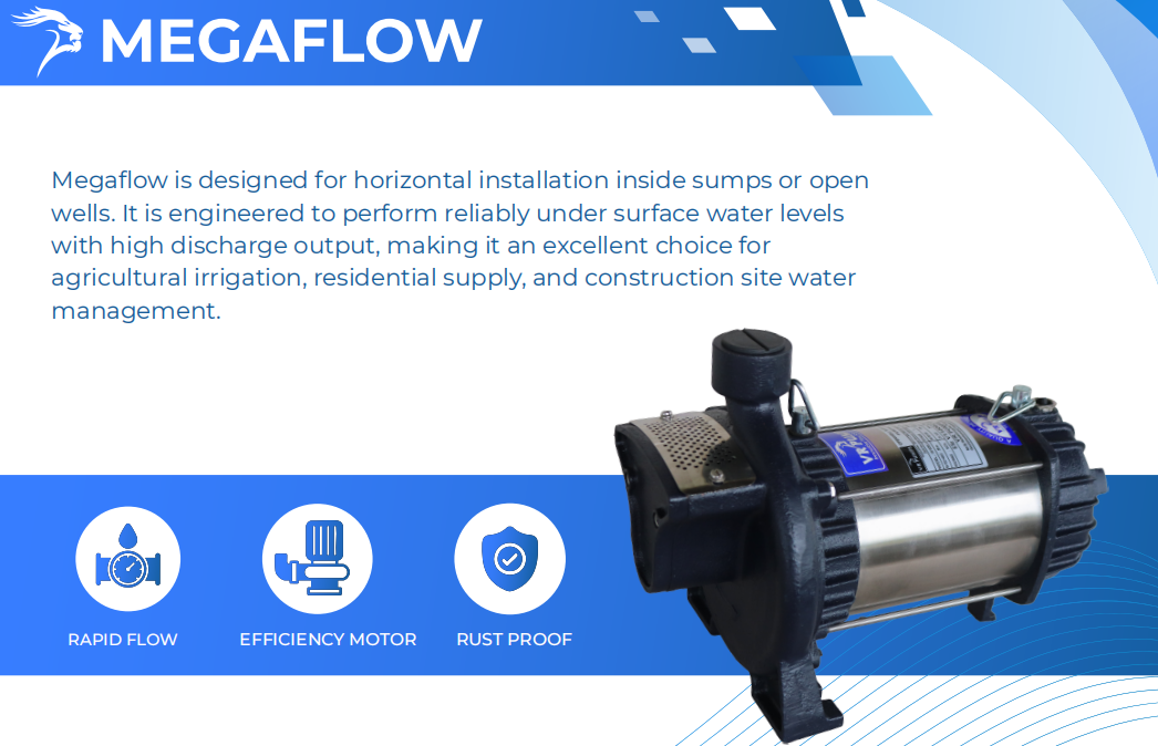 Megaflow is designed for horizontal installation inside sumps or open wells. It is engineered to perform reliably under surface water levels with high discharge output, making it an excellent choice for agricultural irrigation, residential supply, and construction site water management.