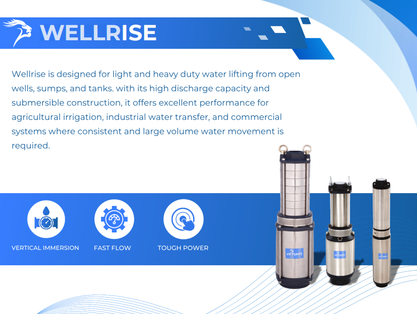 Wellrise is designed for light and heavy duty water lifting from open wells, sumps, and tanks. with its high discharge capacity and submersible construction, it offers excellent performance for agricultural irrigation, industrial water transfer, and commercial systems where consistent and large volume water movement is required.