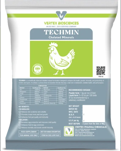 TECHMIN is a scientifically balanced chelated mineral formulation designed to enhance the health, growth, immunity, and productivity of broilers and layers. It contains a precise blend of essential minerals that play a vital role in metabolism, skeletal health, and performance.
