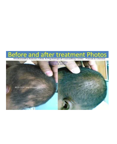 Alopecia areata is a condition that causes round patches of hair loss, and can lead to total hair loss. Types of alopecia: • Alopecia areata -- patches of hair loss, usually on the scalp, but they also can be in the beard or other areas • Alopecia totalis -- complete loss of scalp hair • Alopecia universalis -- total loss of all body hair Symptoms Roundish patches of hair loss are smooth, and may be peach-colored. Hairs that look like exclamation points are sometimes seen at the edges of a bald patch. • Loss of all scalp hair (alopecia totalis), often within 6 months after symptoms first start. • Loss of all scalp and body hair (alopecia universalis). Treatment Homeopathy treatment works well for alopecia areata, For more details & Consultation Feel free to contact us. Vivekanantha Clinic Consultation Champers at Chennai:- 9786901830 Panruti:- 9443054168