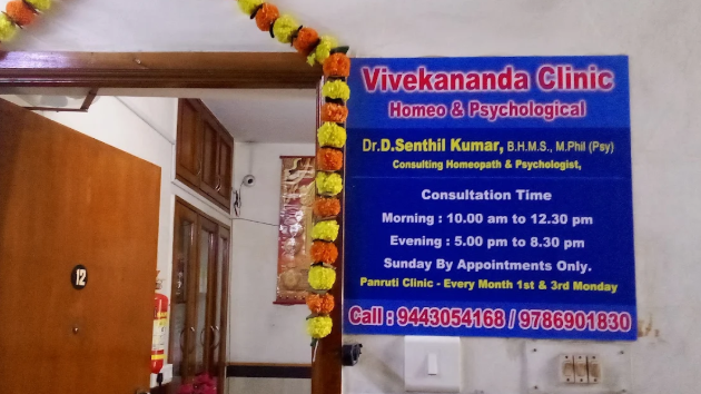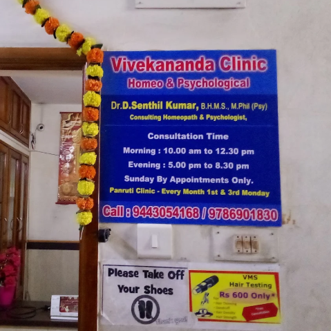 "Vivekanantha Homeo Clinic & Psychological Counselling Centre Established in the year 2000, Vivekanantha Homeo Clinic carries forward a legacy of holistic healing that originally began in 1964. Under the expert guidance of Dr. D. Senthil Kumar B.H.M.S, M.Sc(Psychology), M.Phil (Psychology), we provide integrated healthcare that combines Homeopathy and Psychological Counselling to treat the root cause of ailments. We specialize in treating chronic and acute conditions including Skin Diseases (Psoriasis, HPV Warts, Eczema), Kidney Stones, Infertility, Piles/Fissures, and Alopecia (Hair Loss) without side effects. Beyond physical health, we are a trusted center for psychological care, offering professional counselling for stress, depression,"