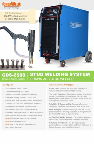 Heavy Duty Stud Welding Machine (Stud Dia Upto 25mm)Model: CDS-2500Stud Diameter: 6 to 25mmTransformer Rating: 2500AWelding Process: Drawn ArcTiming Control, Stepless: 15-2000 msPower: 415v, 3ph, 50/60Hz