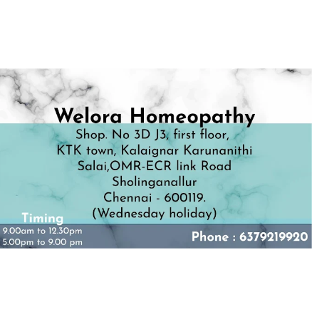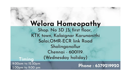 first floor, Welora Homeopathy, OMR - ECR Link road Toll, KK Salai, opposite to Ramaniyam Puravankara apartment,,KTK Town, Sholinganallur,,