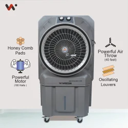 HAVAI Jumbo 130 Desert Cooler |18 Inch Aluminum Blade |400 Feet Area Coverage|130 Litre Tank Capacity, Lockable Wheels, Thick Dense Honeycomb, 1 Year Warranty|3 Speed Control | Grey Color. The video showcases the product in use.